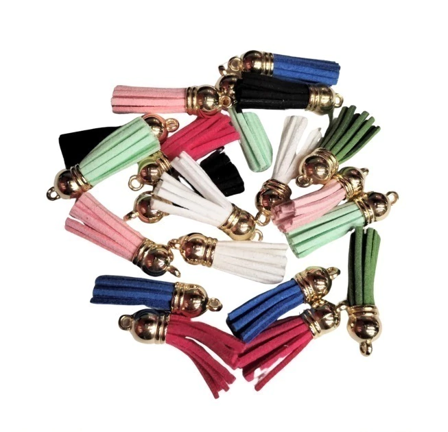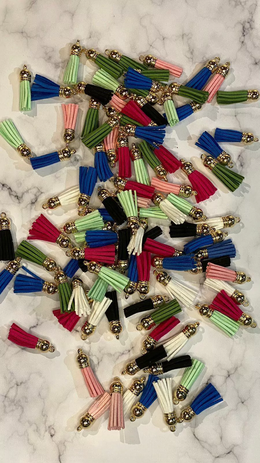 INCLUYE: 100 unidades de borlas con flecos de gamuza colores surtidos, cada una con un capuchon dorado. Medidas aproximadas 3,5 cm de largo x 1 cm de ancho. Los colores varian entre: